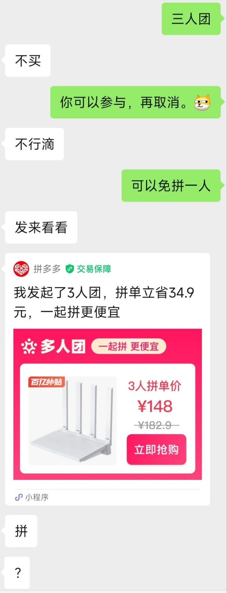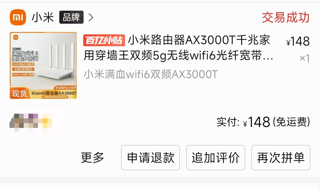 在本科同学推荐下,选择了AX3000T,当时百元价位最具性价比的WIFI6路由器。有个小插曲儿:拼多多拉他拼团,刚说不买,过一会儿又问我拼不拼。于是拼多多三人团+免拼一人,实付148入手。
